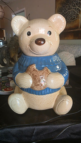 Vintage Metlox Poppytrail Teddy Bear Cookie Jar | Collectible Ceramic Blue Sweater Bear | Mid-Century California Pottery Kitchen Decor