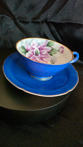 Vintage Royal Sealy Japan Teacup & Saucer Set — Cobalt Blue with Hand-Painted Florals and Gold Trim