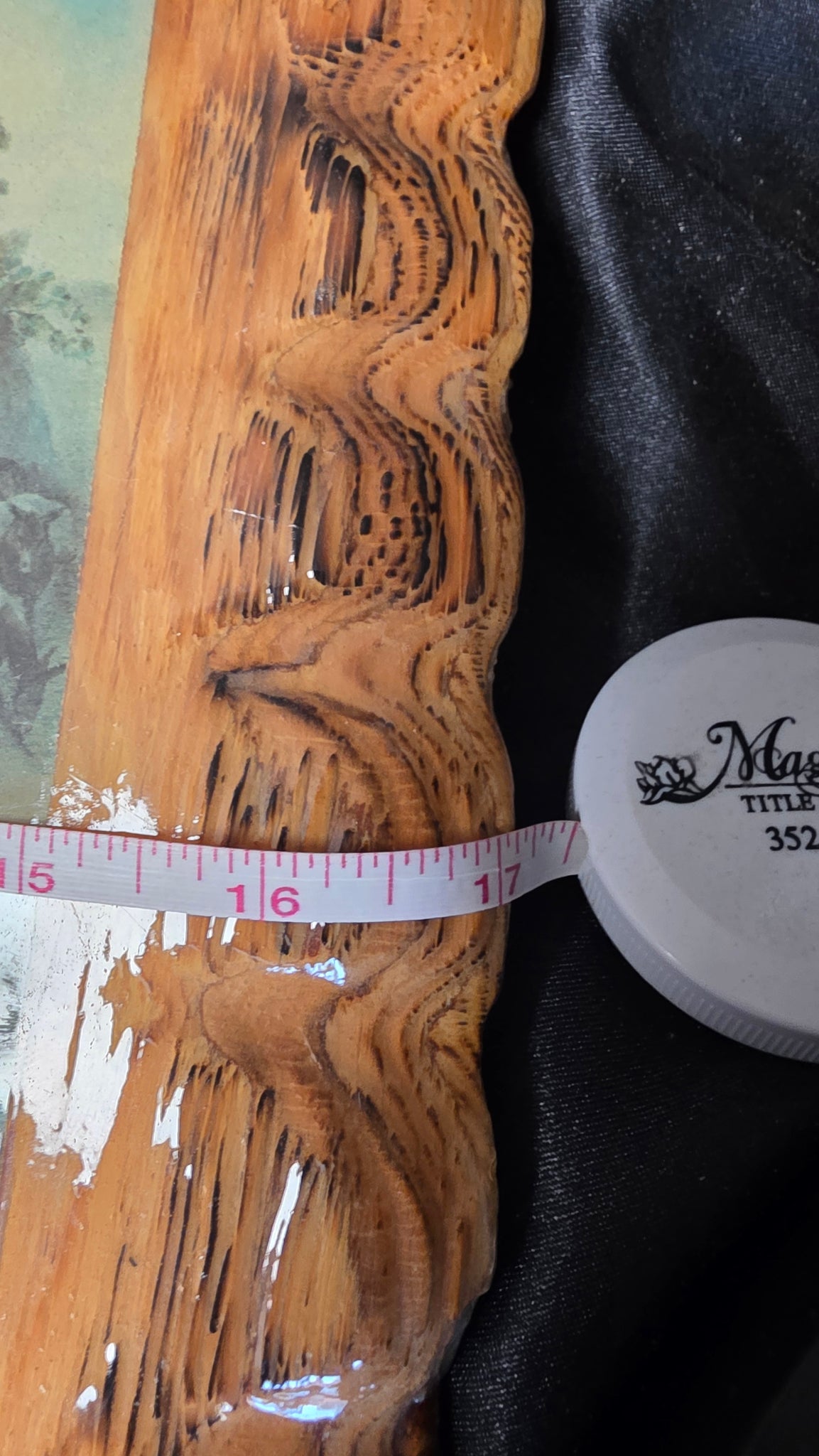 The print is mounted onto a substantial carved wooden plaque, framed by a sculptural wavy-edge border that highlights the natural grain of the wood. The warm tones of the wood complement the muted colors of the artwork, while the glossy protective finish adds depth and sheen across the entire surface, enhancing both the image and the carved frame.