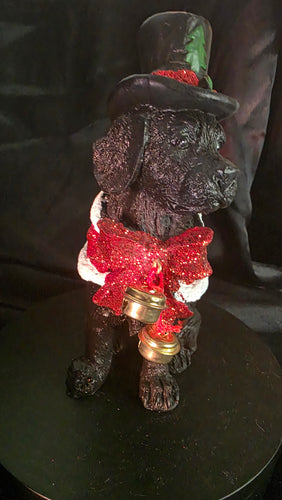 Vintage Black Labrador Christmas Figurine – Resin Holiday Dog Statue with Top Hat, Red Glitter Bow & Bells