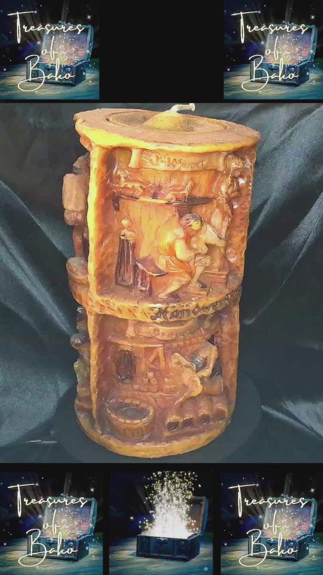 Created from dense, layered beeswax and sculpted while still warm, these intricate 3D relief candles were produced in small batches throughout mid-20th century Germany. Each was carved by hand to depict a scene of daily life — here, the humble baker, shaping loaves within his cozy workshop. Below him, apprentices move with steady purpose, and every brick, beam, and barrel tells a story of labor, warmth, and honest creation.