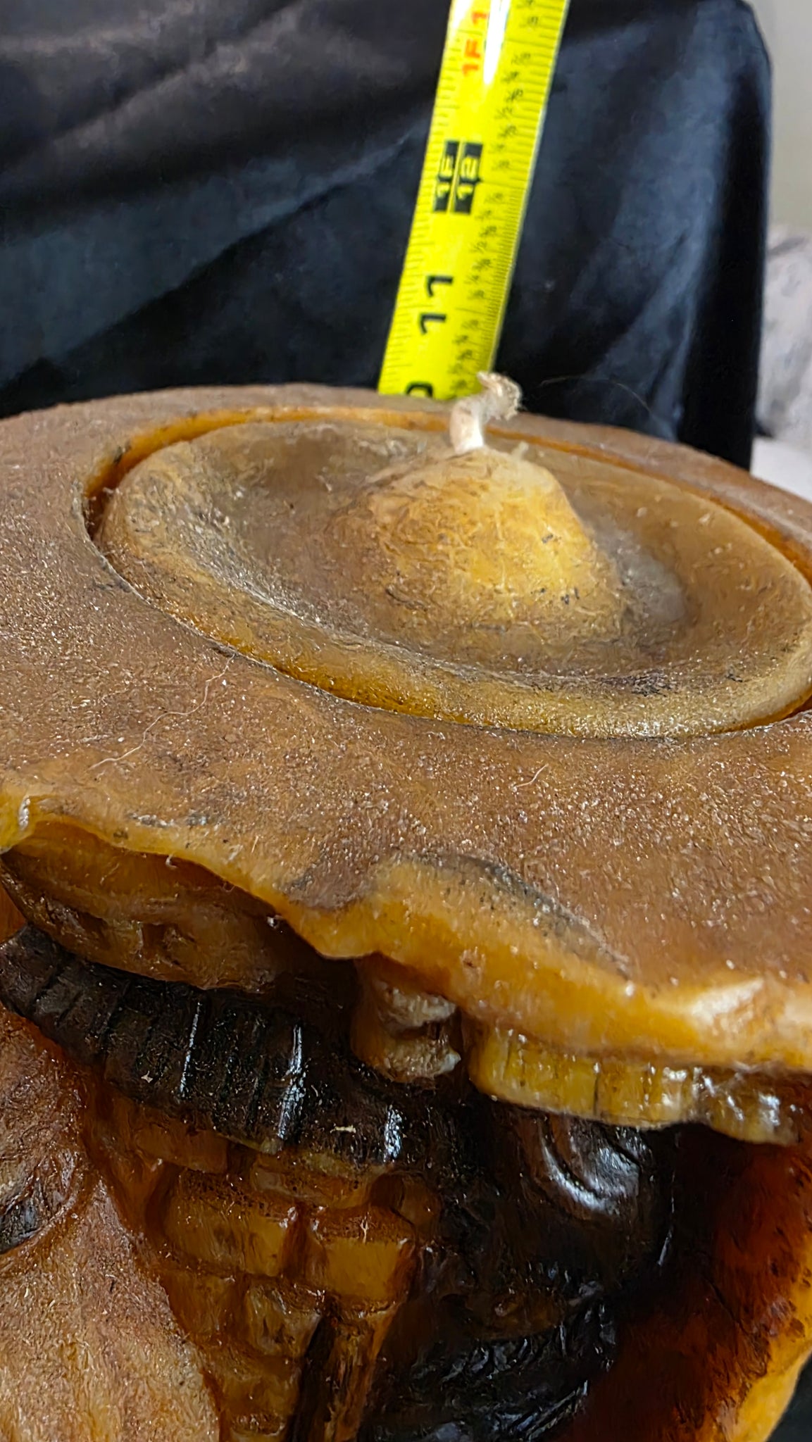 The candle’s rich honey and chestnut tones have deepened beautifully over the decades, enhancing its dimensional relief. Though designed with a wick, many of these candles were never burned — intended instead for admiration as sculptural decor. Their layered composition often includes an inner candle core that can be lit without disturbing the ornate exterior, allowing the outer carvings to glow softly from within.