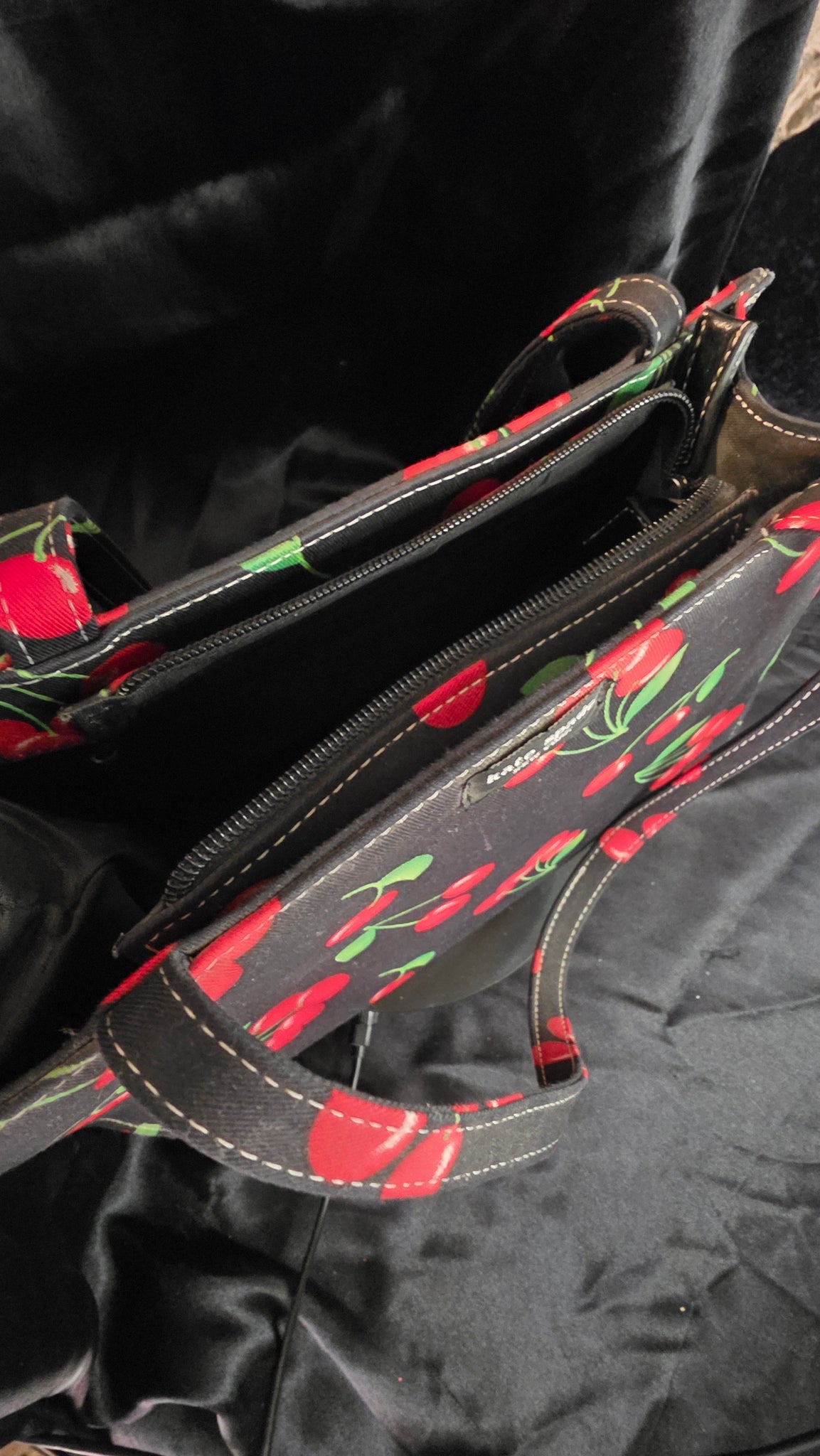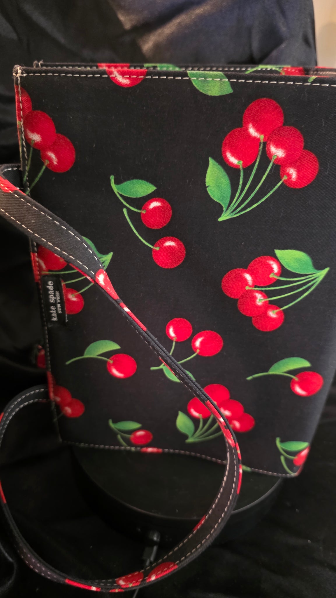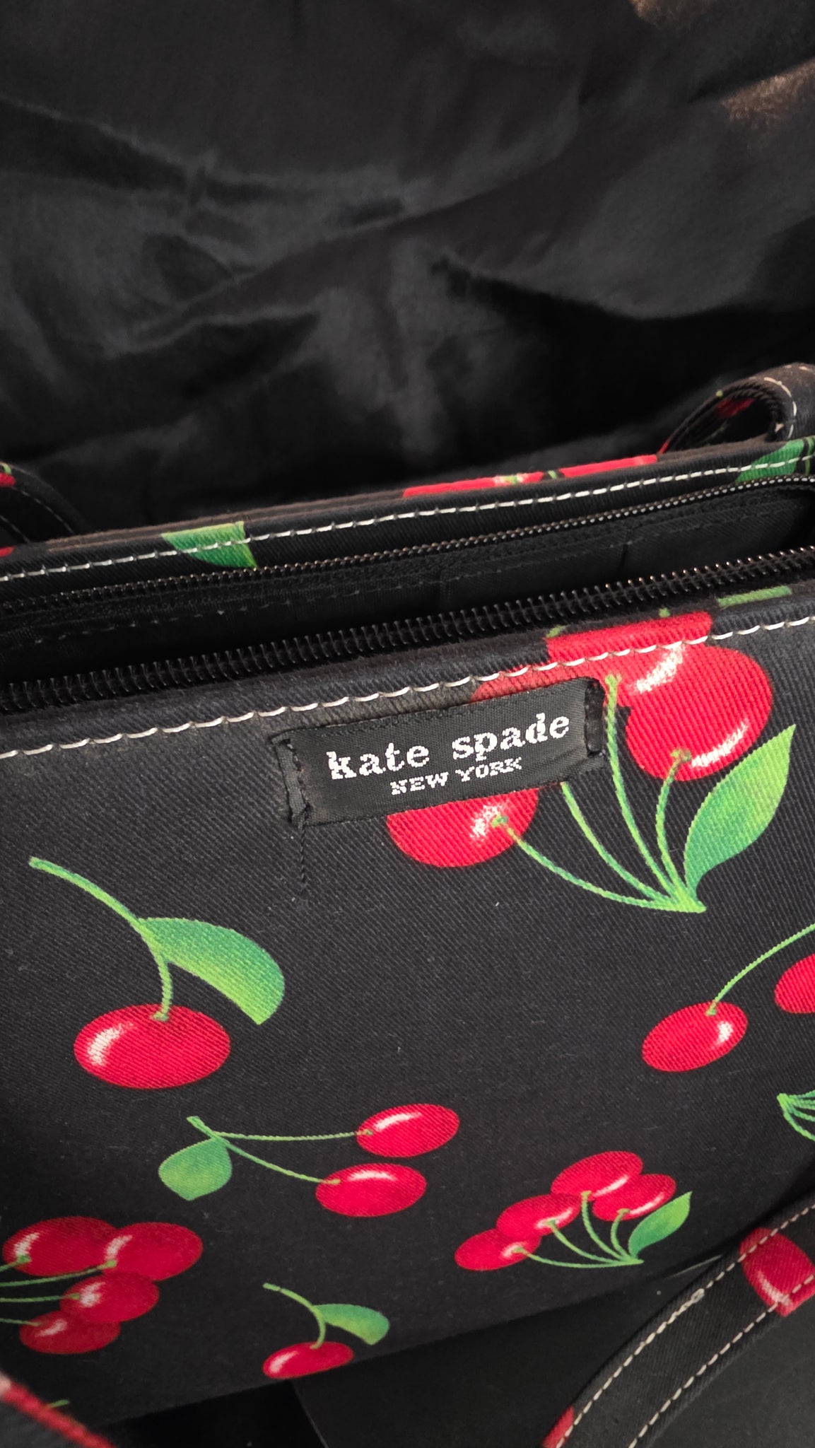 Vibrant, playful, and unmistakably chic — this Kate Spade New York Cherry Lane Tote captures the spirit of modern femininity with a nostalgic nod to classic mid-century pop prints. Crafted from durable coated canvas, this brand new, never-used handbag features the signature black backdrop adorned with bold red cherries and fresh green stems, a motif that’s become iconic among Kate Spade collectors and style lovers alike.