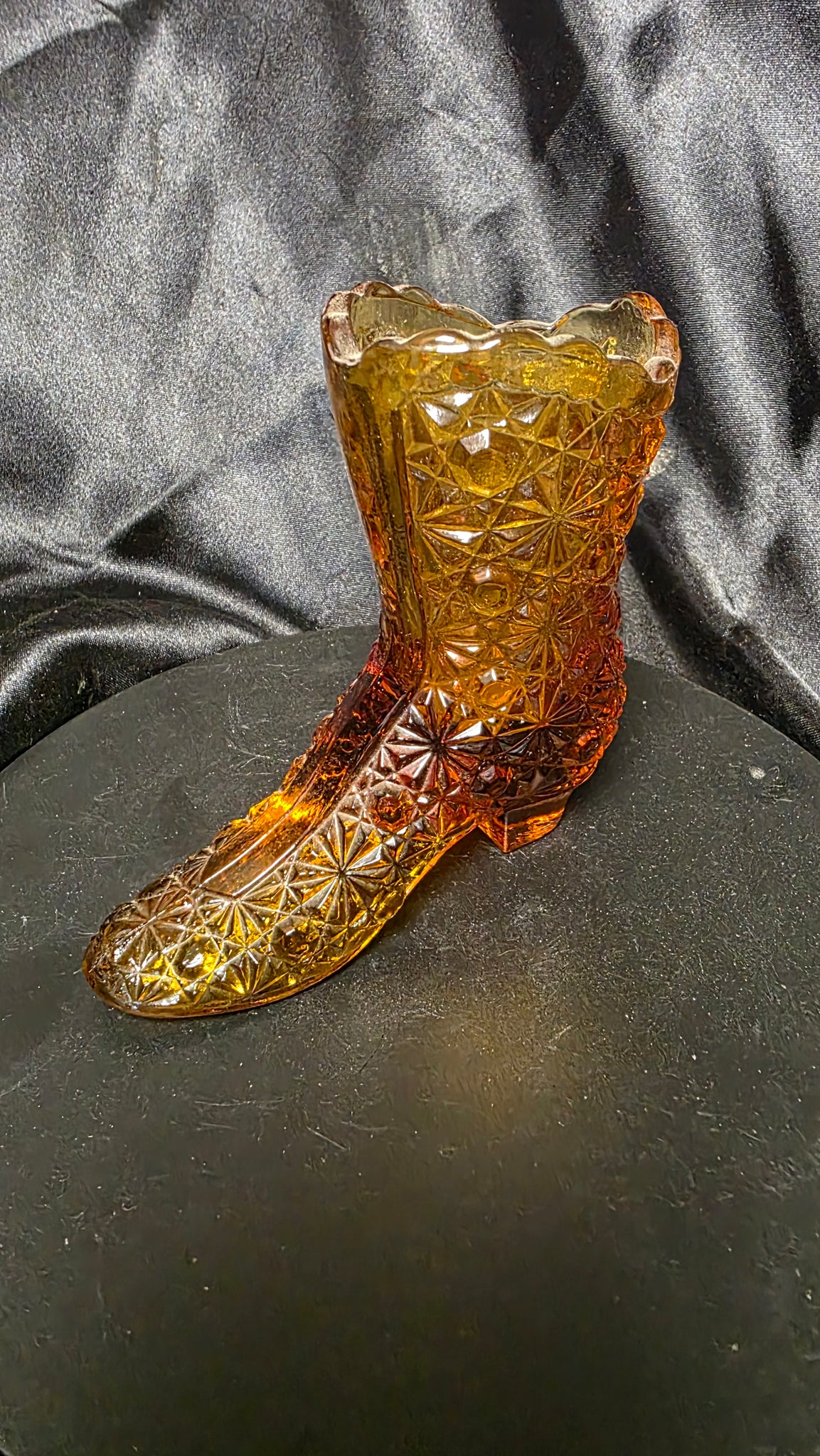 Radiating warmth through its luminous amber glow, this vintage Fenton pressed glass boot is a charming expression of classic Victorian-inspired design. The sculptural silhouette, complete with a delicate heel and gracefully flared rim, transforms simple glass into an object of nostalgic beauty — a piece that feels equally at home in a curated display cabinet or catching afternoon light on an open shelf.